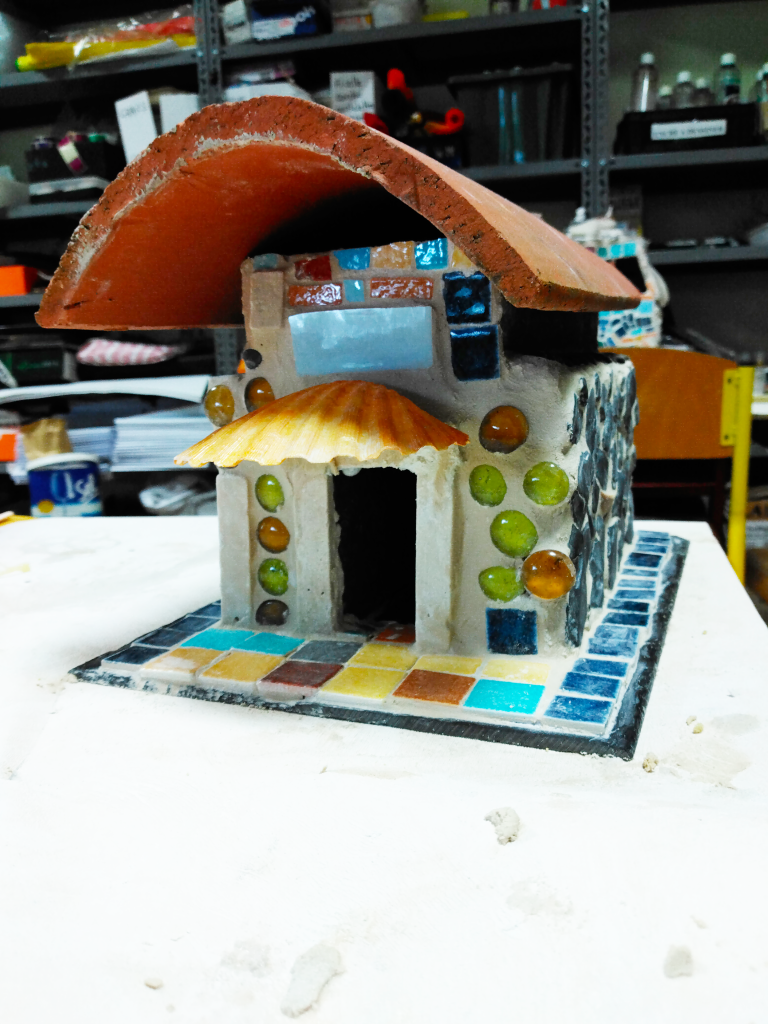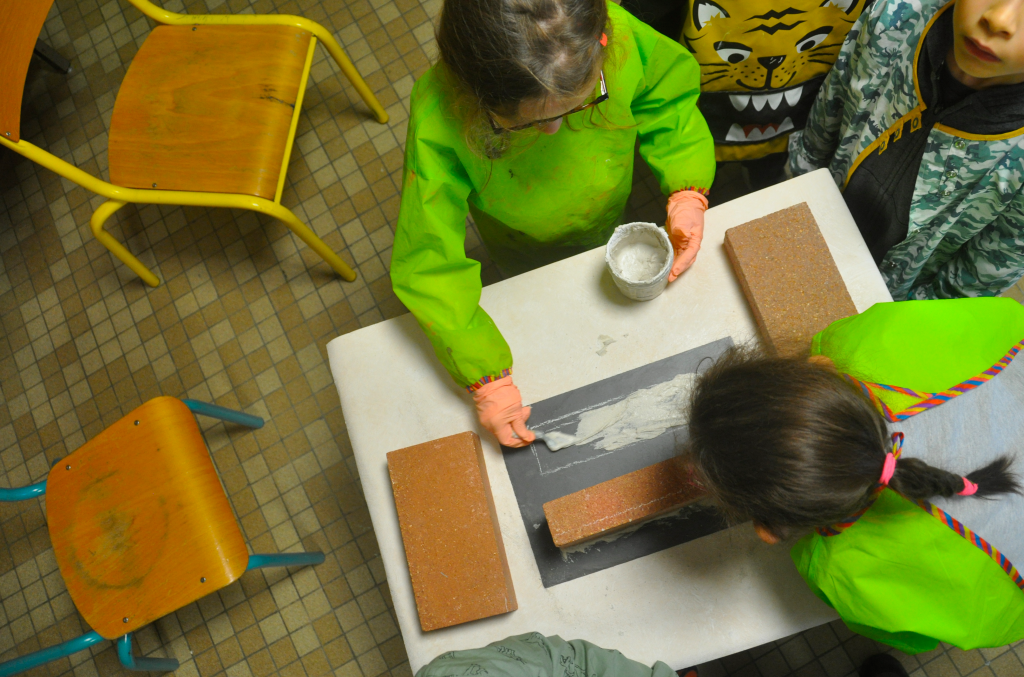 2 classes imaginent et créent 3 mini-maisons pour les êtres des Petits Peuples. Avec les matériaux apportés par les familles : cailloux, coquillages, bouts de verre polis, morceaux d’ardoise et de mosaïque... Les élèves font de la mini-maçonnerie !