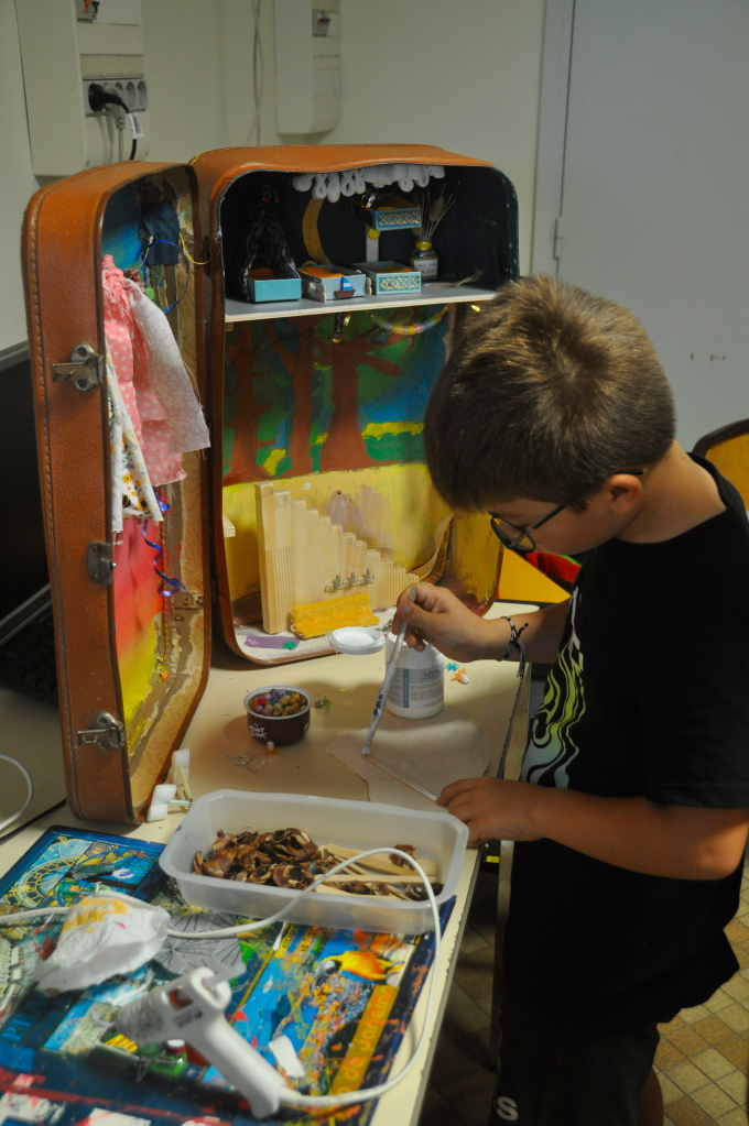 Les élèves transforment une vieille valise en espace de jeu. Il s’approprient tous les moyens pour décorer, aménager la valise afin d’offrir un abri aux êtres magiques des Petits Peuples : peinture, collage, découpe de tissus, détournement d’objets…