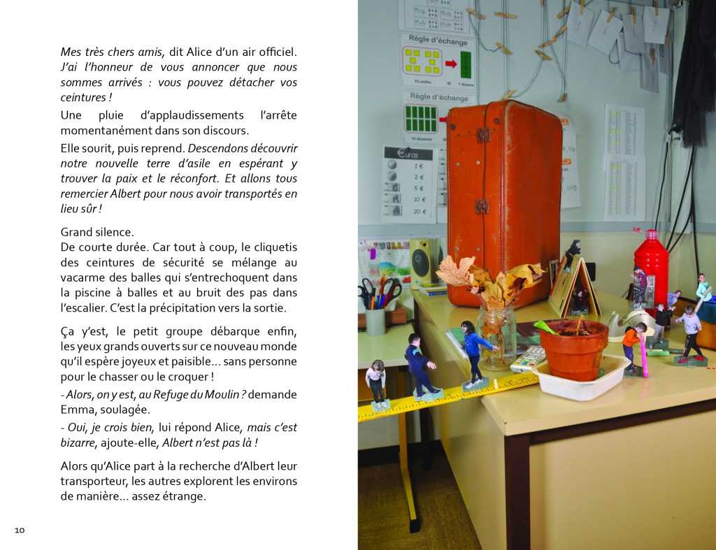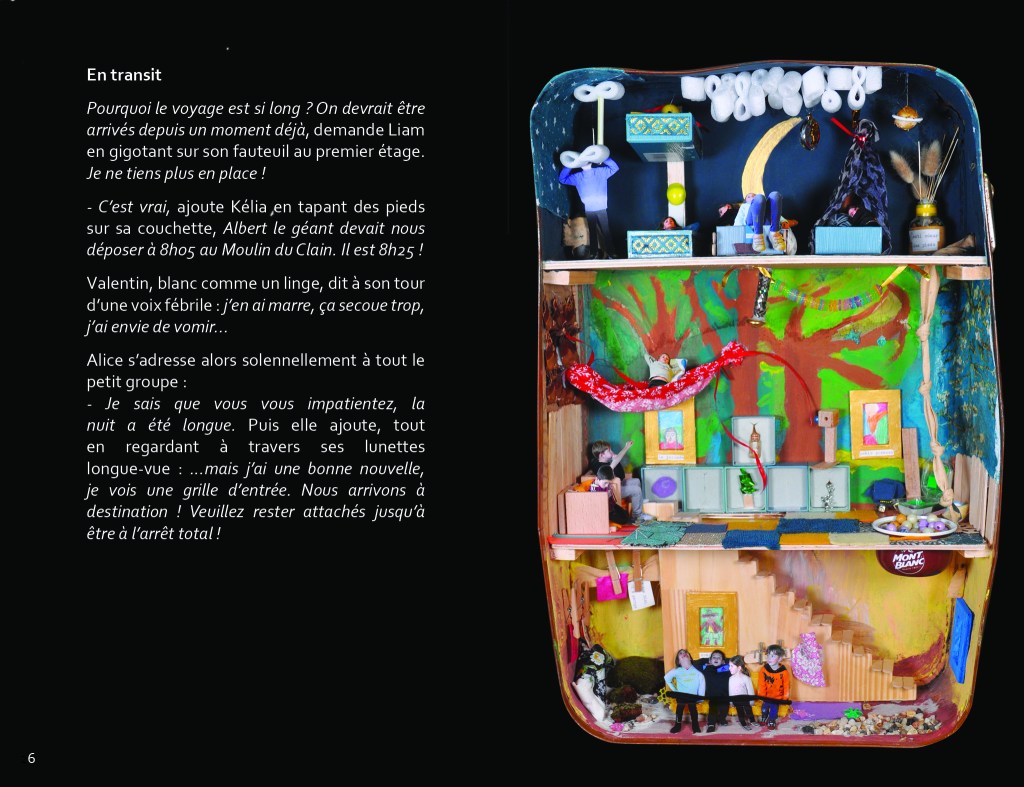 Des élèves volontaires ont inventé et mis en scène une histoire. Le challenge de départ était de faire voyager les personnages dans les 3 décors réalisés en amont par les classes participantes : la valise aménagée, les petites maisons et les jeux en bois.