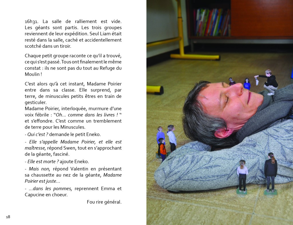 Quoi de plus exaltant que de faire eux-mêmes partie de l’aventure ! Certains élèves sont dans la peau de Minuscules, et d’autres dans celles de Géants. Une maîtresse, Madame Poirier, a été invitée par les élèves pour faire partie de l’histoire.