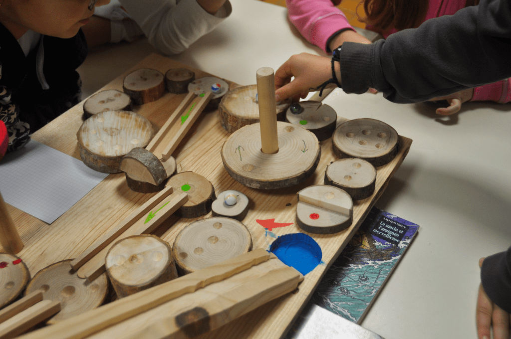 Les élèves ont d’abord imaginé et dessiné des parcours de jeu d’aventure. Puis, à l’aide du bois à disposition, ils ont construit et collé les différentes parties du parcours : colonnes, rondelles, planche…