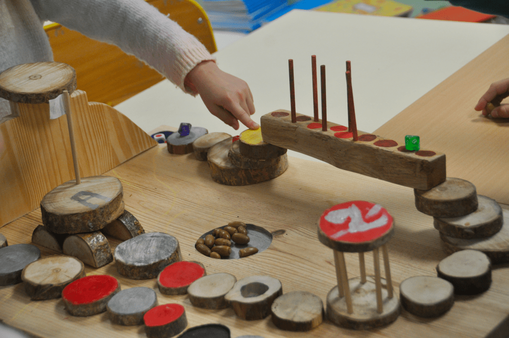 Les jeux en bois sont à disposition dans le hall de l’école pendant les temps de récréation.